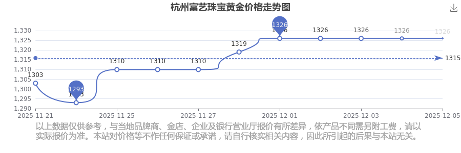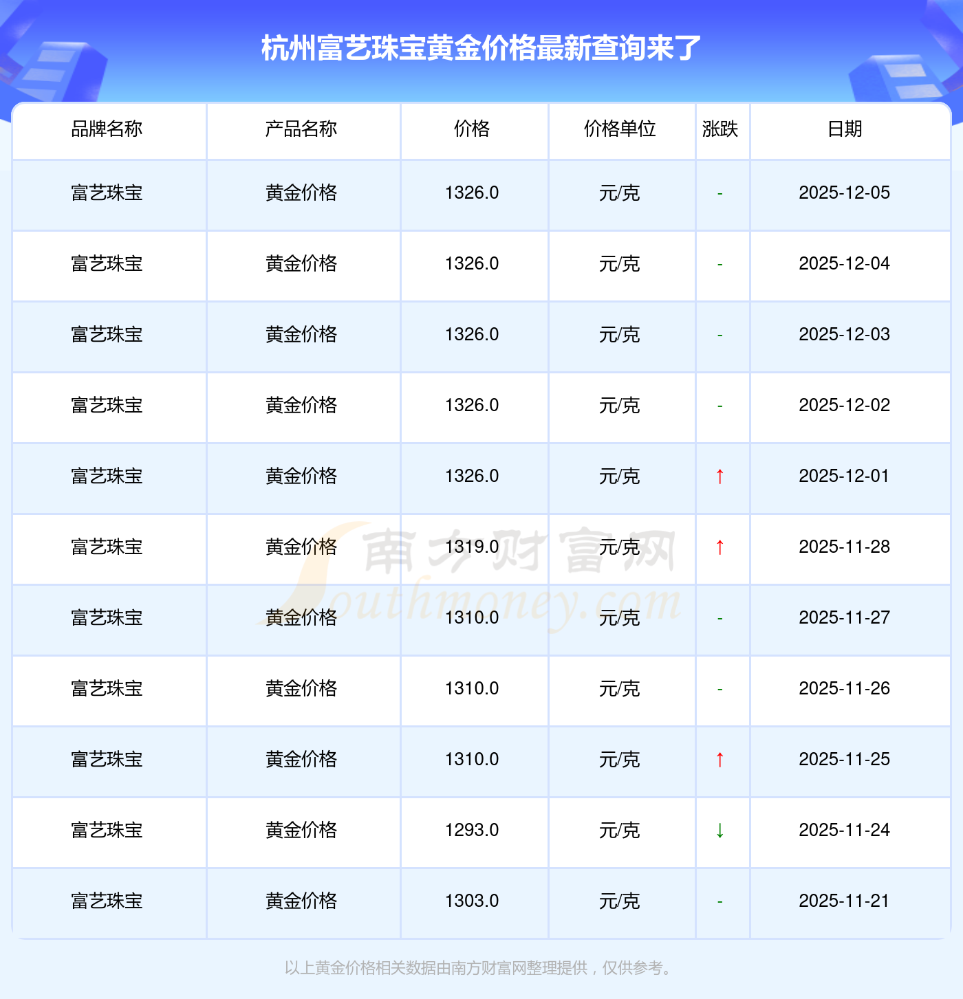 今日杭州富藝珠寶黃金價格最新為:1326.0元/克。