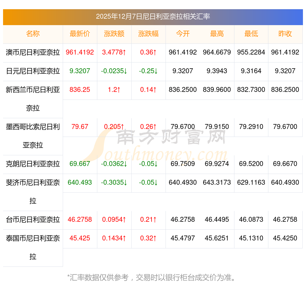 2025年12月7日尼日利亞奈拉相關匯率查詢