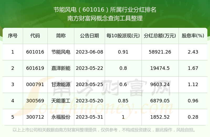 節(jié)能風電最新一次公布的分紅方案為10派0.91元。本次權(quán)益分派股權(quán)登記日為2023年6月14日,除權(quán)除息日為2023年6月15日,派息日為2023年6月15日。