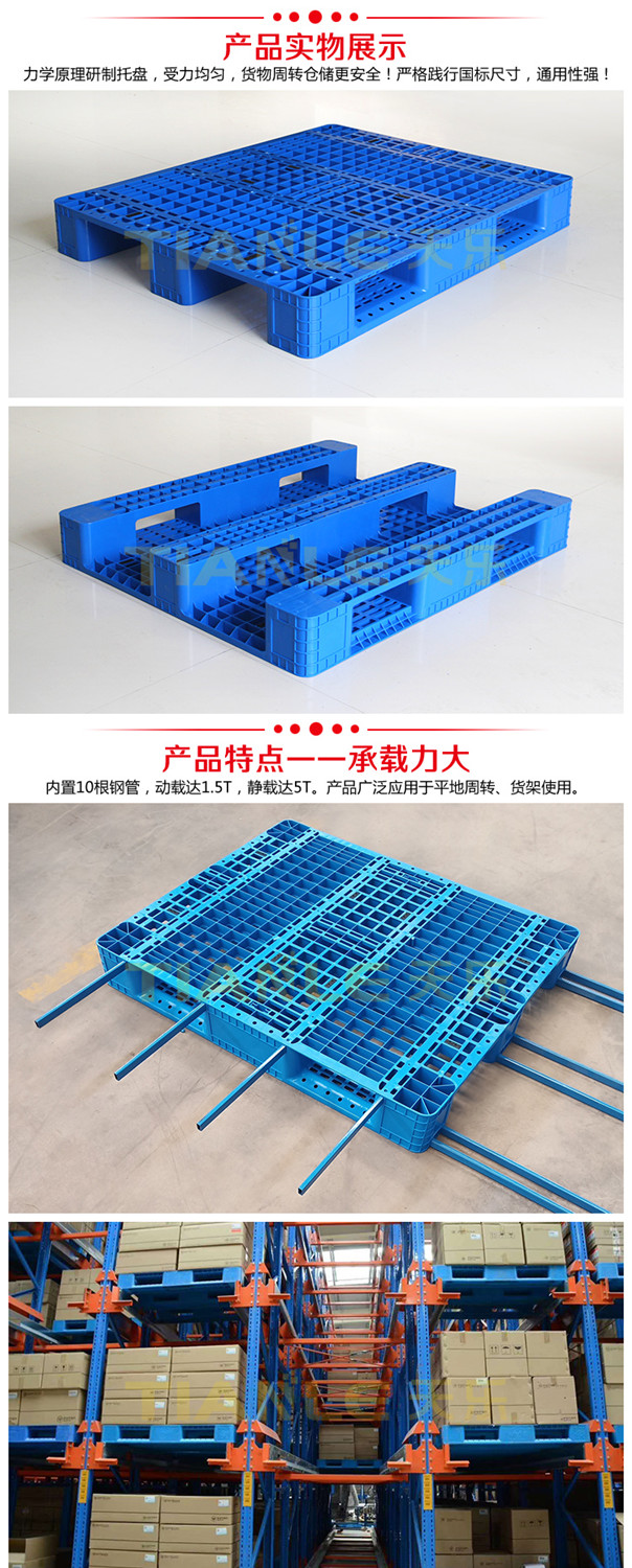 1) 動(dòng)載能力相差0.5噸以上,比如1210川字網(wǎng)格塑料托盤,沒(méi)有內(nèi)置鋼管時(shí),動(dòng)載1噸,內(nèi)置鋼管后動(dòng)載能力可以達(dá)到1.5噸以上。