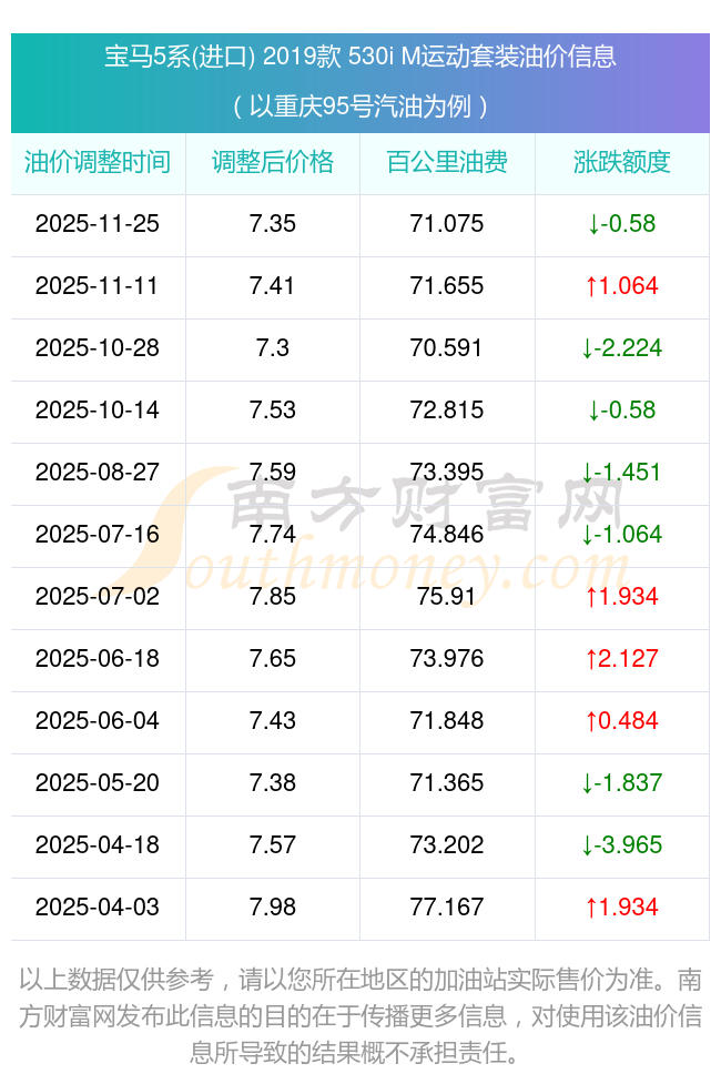 按照11月25日95號汽油最新調(diào)整價(jià)格7.35元/升來計(jì)算(以重慶為例),該車型百公里平均油費(fèi)為71.075元,按照上一輪11月11日調(diào)整價(jià)格7.41元/升來計(jì)算,百公里平均油費(fèi)為71.655元,對比上一輪少花0.58元,下一輪油價(jià)調(diào)整時(shí)間為12月8日24時(shí)。