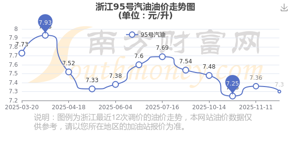 浙江95號汽油12月7日價格為7.3元每升,本次油價調整時間是11月25日,相對上次調整后11月11日的油價是7.36元/升,下調了0.06元,下調幅為0.815%。