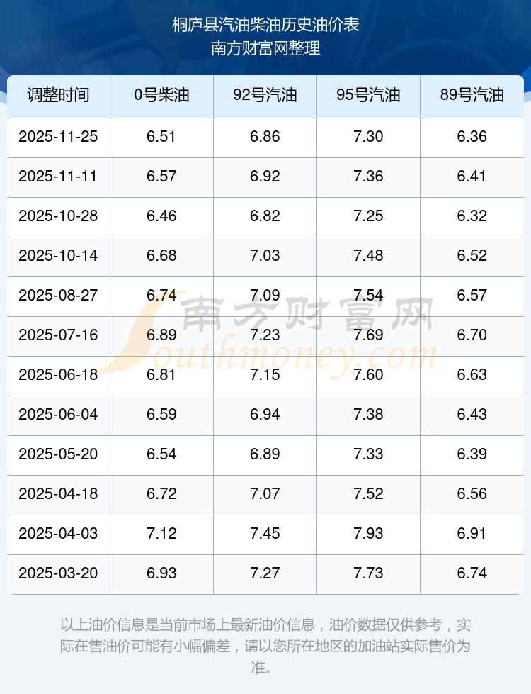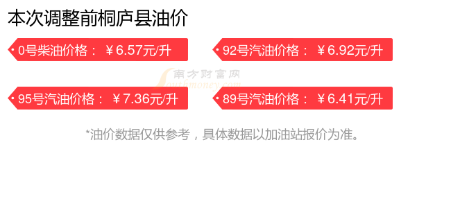 12月7日,桐廬縣汽油、柴油每升最新價格為:92號汽油為6.86元,下跌了0.06元;95號汽油為7.3元,下跌了0.06元;89號汽油為6.36元,下跌了0.05元;0號柴油為6.51元,下跌了0.06元,調整時間為11月25日。