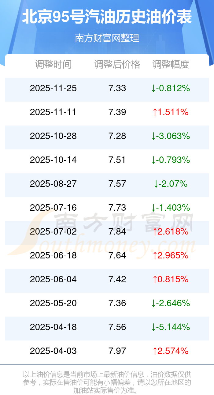 12月7日北京95號汽油的價格是11月25日調整后的價格,具體是7.33元/升,本輪北京95號汽油油價降了0.06元。