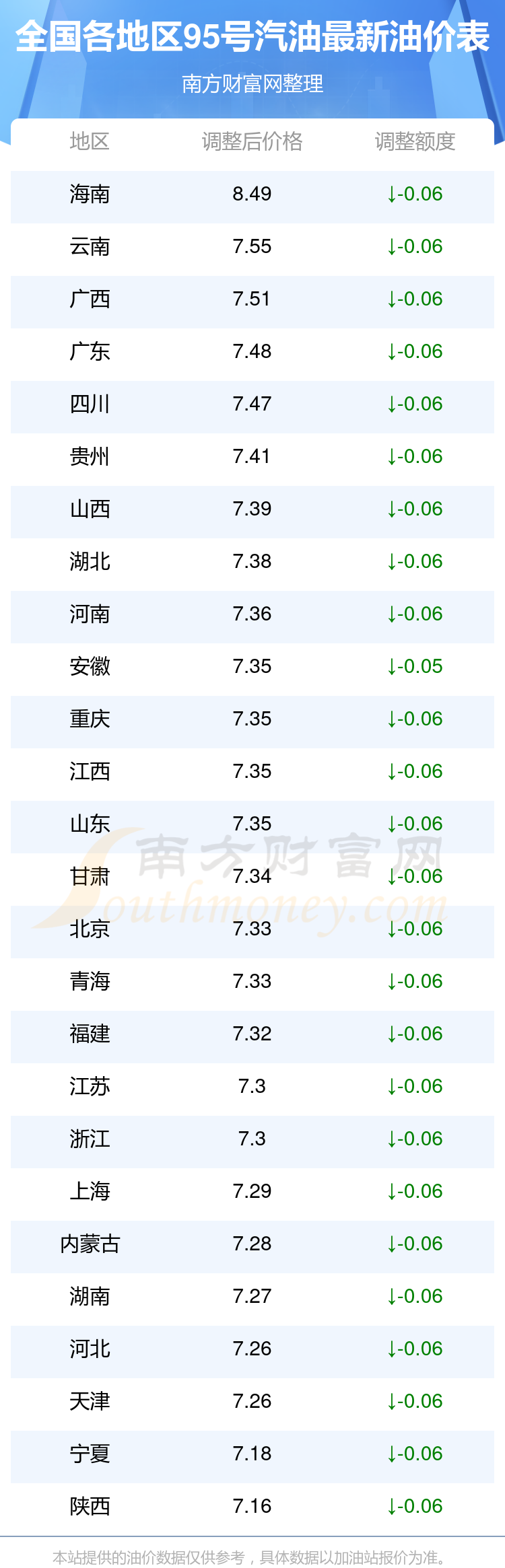 油價數據僅供參考,請以您所在地區的加油站報價為準。南方財富網發布此信息的目的在于傳播更多信息,對使用該油價信息所導致的結果概不承擔任何責任。