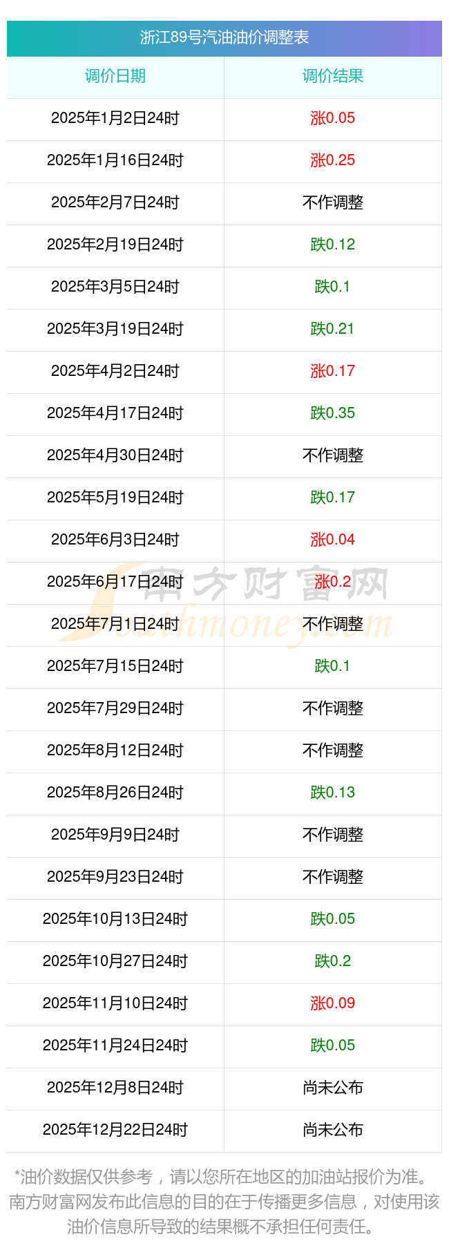 12月7日,浙江89號汽油的價格是6.36元每升,本次的調整時間為11月25日,對比上次的調整降了0.05元,降0.78%,下次調整時間為12月8日24時,還有1.21天。