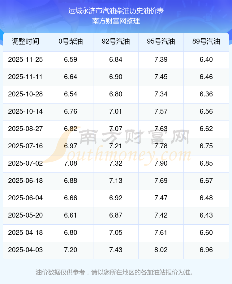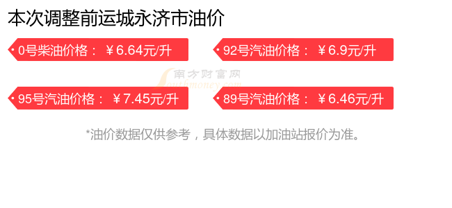 運城永濟市汽油柴油12月7日每升的價格為11月25日調整后的價格,各油價詳情如下:92號汽油6.84元;95號汽油7.39元;89號汽油6.4元;0號柴油6.59元。
