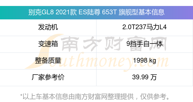別克GL8 2021款 ES陸尊 653T 旗艦型動力上搭載的是一臺2.0T237馬力L4渦輪增壓發動機,匹配9擋手自一體自動檔變速箱,燃料形式為汽油,常規整備質量1998kg,廠家參考價39.99萬元。
