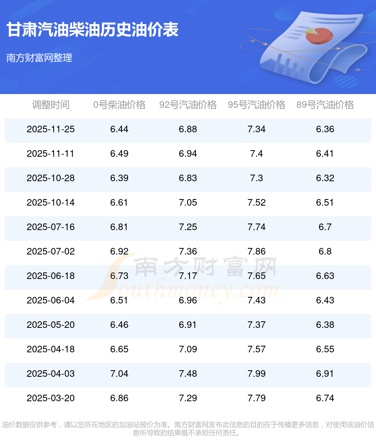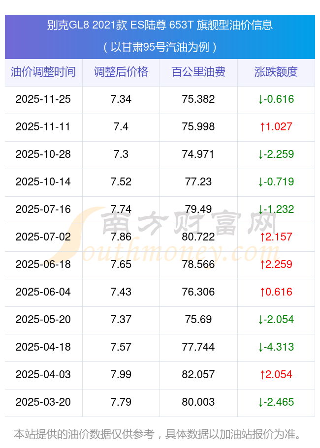 按11月25日95號汽油最新調整價格7.34元每升來計算(以甘肅為例),該車型百公里平均油費為75.382元,按上一輪11月11日調整價格7.4元每升來計算,百公里平均油費為75.998元,對比上一輪少花0.616元,下一輪油價調整時間為12月8日24時。